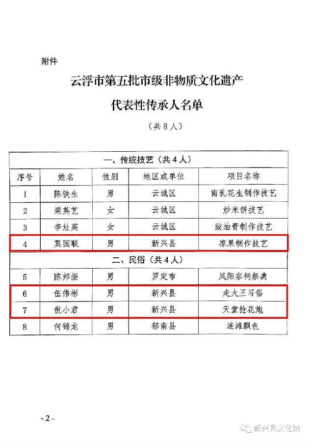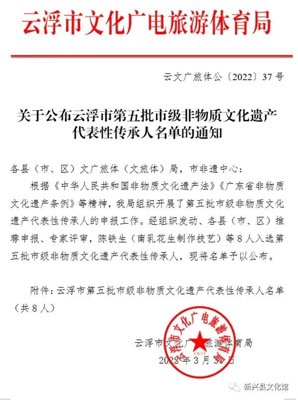 近日,根据《中华人民共和国非物质文化遗产法》、《广东省非物质文化遗产条例》等相关法律法规,云浮市文化广电旅游体育局组织开展了第五批市级非物质文化遗产代表性传承人的申报工作。经专家评审,新兴县3人入选云浮市第五批市级非物质文化遗产代表性传承人。