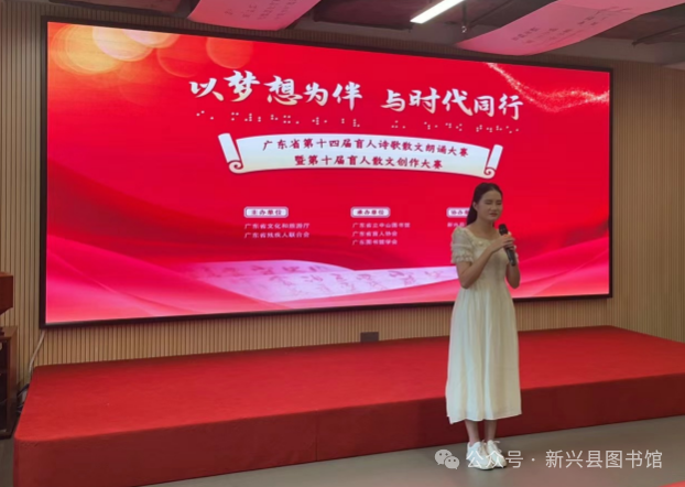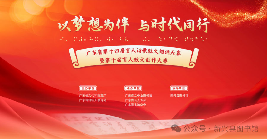 广东省盲人诗歌散文朗诵比赛自2013年举办以来,得到了社会各界的大力支持,活动影响力持续扩大,成为我省盲人群体的年度文化盛事和文化助残的重要品牌活动。4月23日,由广东省文化和旅游厅、广东省残疾人联合会联合主办,广东省立中山图书馆、广东省盲人协会、广东图书学会承办,新兴县图书馆协办了以梦想为伴 与时代同行 广东省第十四届盲人诗歌散文朗诵暨第十届盲人散文创作活动。