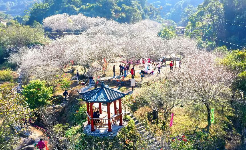 眼下,正是赏梅花的好季节。在广东天露山旅游度假区和里洞镇葛冲村委上盆山村,沿线的梅花竞相绽放、美不胜收。放眼远眺,漫山遍野的梅花点缀整个山头,在阳光照耀下,与房屋、溪流相映成画,让人恍如进入仙境。近处细看,一朵朵梅花洁白淡雅,花香扑鼻,引来蜂蝶翻飞。漫步在梅花林中,一步一景,不少游客一路徜徉,赏花赏景、拍摄留影,轻松惬意。