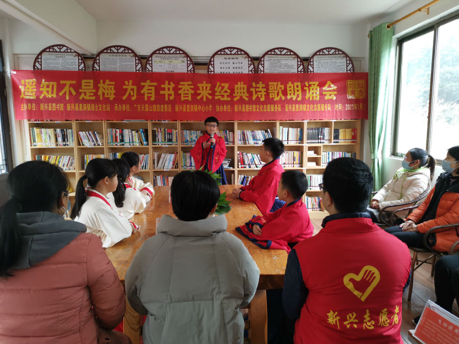 梅花,香色俱佳,独步早春,具有不畏严寒的坚强性格和不甘落后的进取精神。为提高广大群众对诗歌的兴趣以活动促阅读,进一步激励广大群众阅读经典书籍,陶冶情操、拓宽视野。在这个赏梅的季节里,为营造浓郁的书香氛围,让梅香与书香融为一体享受阅读的乐趣。新兴县图书馆、里洞镇文化站于2021年1月7日联合举办遥知不是梅 为有书香来经典诗歌朗诵会。